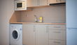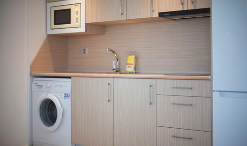 La cocina está equipada con nevera combi Balay de 180 de alto, campana de extracción Balay, vitroceramica de inducción Balay, pica para fregar los platos incluyendo bayeta, estropajo y jabón de platos, Microondas con Grill Balay, Lavadora de 6kg Balay (dispone de zona para tender la ropa en la parte de detrás del edificio al cubierto o al descubierto). Dispone de utensilios básicos para cocinar como platos, vasos, abridor de botellas, cubiertos, sartén, olla, madera de cortar, cuchillo grande, tazas, cuencos, bolsa de recambio de basura.